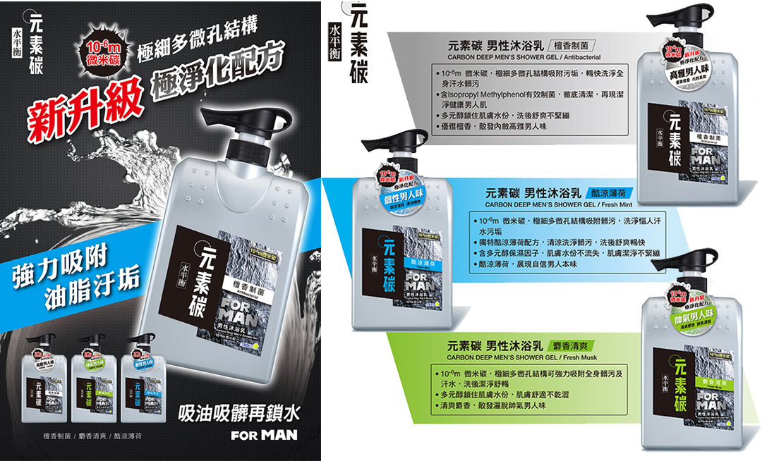 全新上市 水平衡『元素碳男性沐浴乳』水平衡元素碳男性沐浴乳For Man《檀香制菌 /麝香清爽 /酷涼薄荷 》全面進化 10-6m微米碳 新升級極凈化配方 吸油、吸髒、再鎖水 ▲10-6m微米碳,極細多微孔結構可強力吸附污垢,唱快洗淨全身汗水髒污 ▲含Isopropyl Methylphenol有效制菌,能徹底清潔,再現潔淨健康男人肌 ▲多元醇保濕因子鎖住肌膚水份,肌膚舒爽不緊繃。 更多產品資訊 http://www.cellina.com.tw/products-category-02.php?id=105&lang=tw